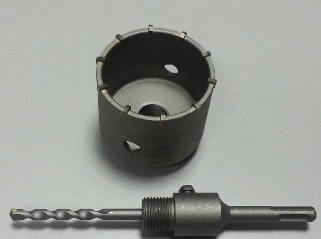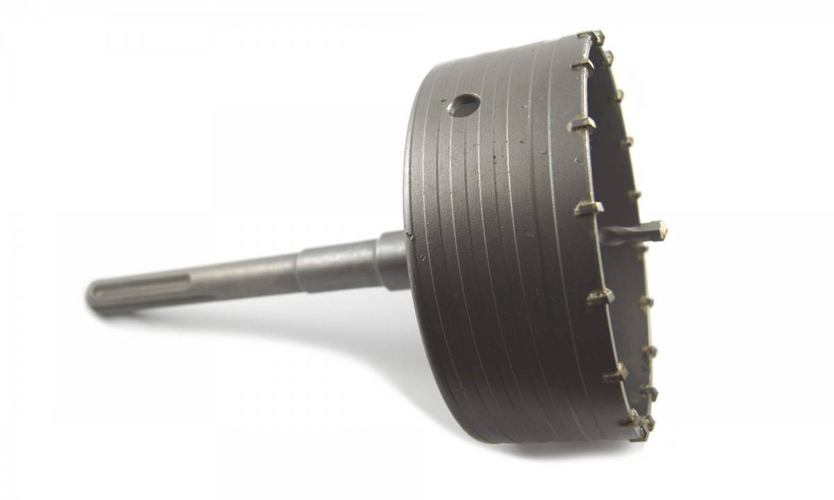Если взглянуть на конструкцию инструмента, он напоминает трубу конкретного диаметра, с прорезями в верхней части. Задача последних – удалять пыль и частицы бетона в ходе сверления. С обратной стороны «трубка» закрыта, но есть отверстие для установки хвостовика.