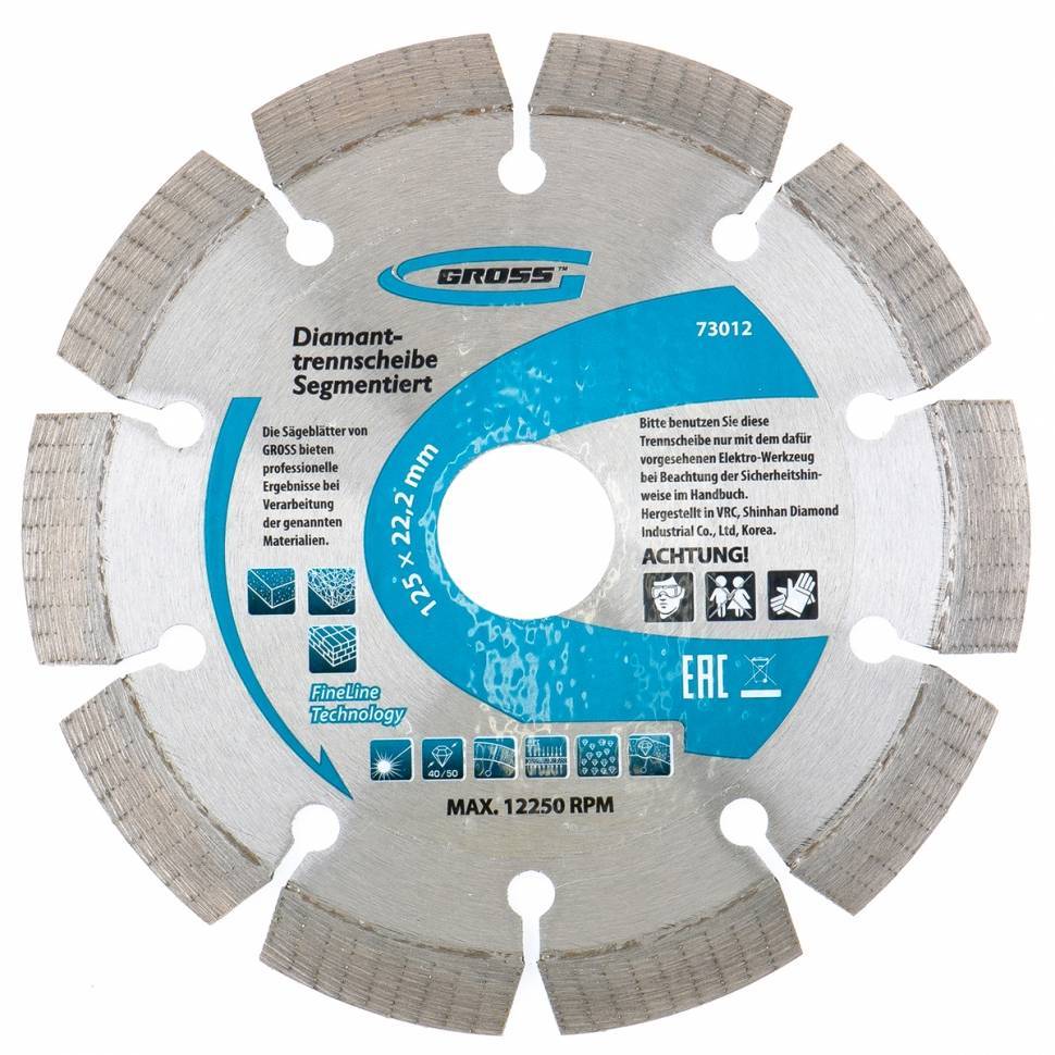 Оснастка популярного японского производителя предназначена для сухой резки бетона, кирпича, искусственного камня. Имеет сегментированную структуру, которая улучшает качество реза. Диаметр 125 мм позволяет использовать в фирменных алмазных пилах и классических угло шлифовальных машинах. При интенсивной работе почти не нагревается, достаточно небольших перерывов на 2-3 секунды, чтобы инструмент вновь был готов к резке бетона.