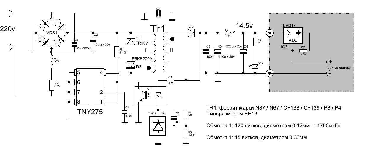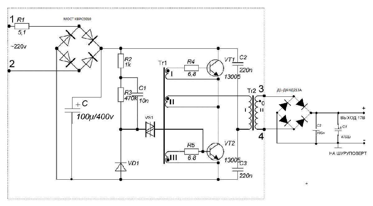 Что в подавляющем большинстве у них общего? Кроме импульсных модификаций – понижающий трансформатор, так как речь идет о вторичном (питающем для шуруповерта) напряжении номиналом 18 В. В этом и главная сложность. Подобрать Тр можно, но, к сожалению, на схемах указываются не все параметры радиодеталей. Если обозначена величина сопротивления, то не указана мощность; не все типы полупроводников обозначены и тому подобное. Да и по трансформатору информации практически никакой – сечение проводов, количество витков и так далее. Следовательно, расчеты придется делать самому.