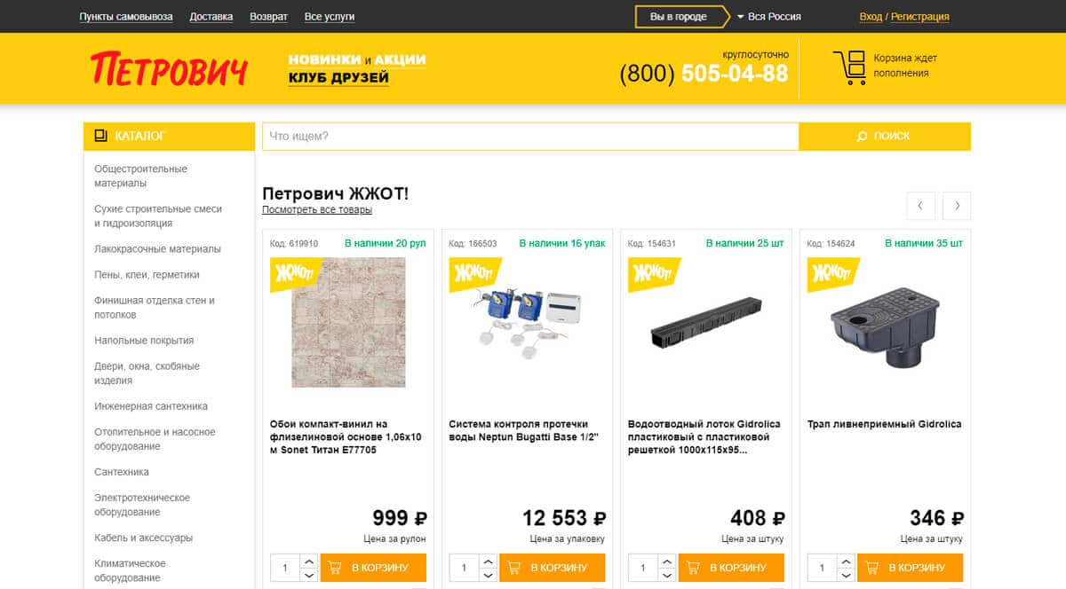 Магазин строительных инструментов Петрович был основан в 2003 году. Они известны как торговый дом со строительными материалами, сантехникой, спецодеждой, дверьми и электротехническим оборудованием. Стоимость доставки в пределах страны начинается от 150 рублей до пункта выдачи заказов. Компетентная служба поддержки всего поможет с возникшими вопросами.