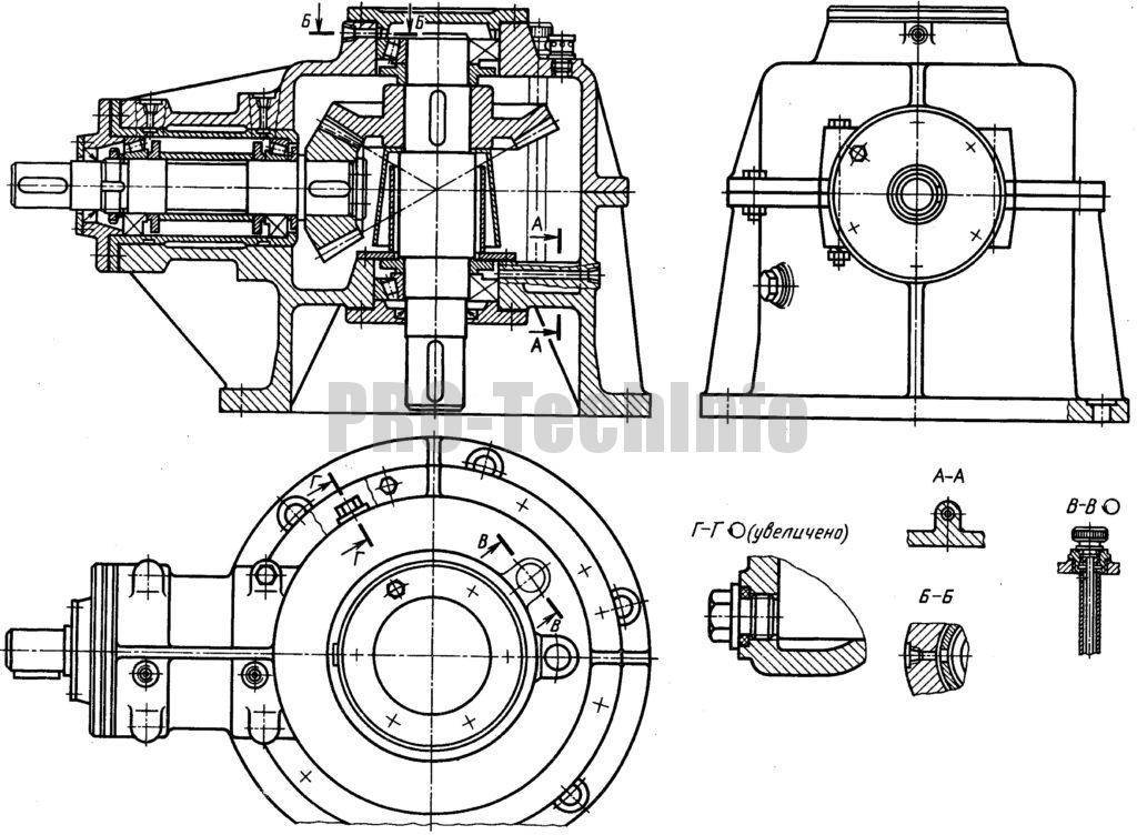 Редуктор конический одноступенчатый с горизонтальным быстроходным и вертикальным тихоходным валами. Особенностью конструкции редуктора является система смазывания и защиты подшипников. Зацепление смазывается окунанием шестерни в масло. Подшипники ведущего вала смазываются раздельно и каждый подшипник имеет двустороннее мазеудерживающее устройство. Нижний подшипниковый узел защищен от попадания в него жидкого масла двумя стаканами, неподвижно закрепленными: один — на корпусе, а другой — на колесе. Стакан, закрепленный на колесе, имеет форму расширяющегося книзу конуса, что обеспечивает отбрасывание масла от вала при вращении.