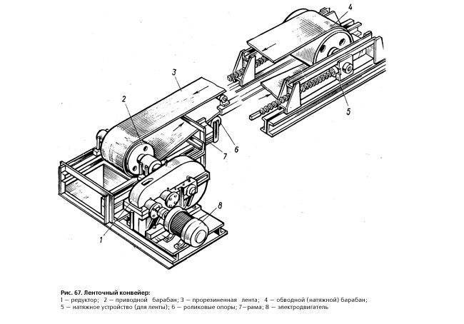 Для скольжения транспортерной ленты на раме располагаются специальные ролики. Для её натяжения используются два крупных ролика, которые носят названия барабанных. Один из них – натяжной. Он зафиксирован на подшипниковом узле и используется для регулировки натяжении ленты. Второй – приводной барабан. Он установлен на противоположном конце конвейера и имеет специальный вал, соединенный через редуктор с электродвигателем. Вращательное движение, передаваемое от мотор-редуктора или электродвигателя к приводному барабану, приводит ленту транспортера в движение.