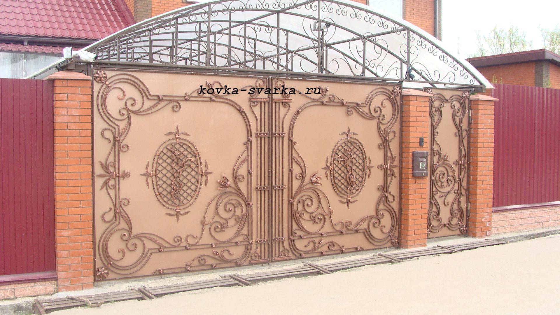 В отличие от ворот с калитками из других материалов, художественная ковка обладает высокой прочностью. Они очень эффектно выглядят и прекрасно дополняют общий ансамбль ворот. Подходят для распашных, откатных, прозрачных или закрытых конструкций одинаково хорошо.