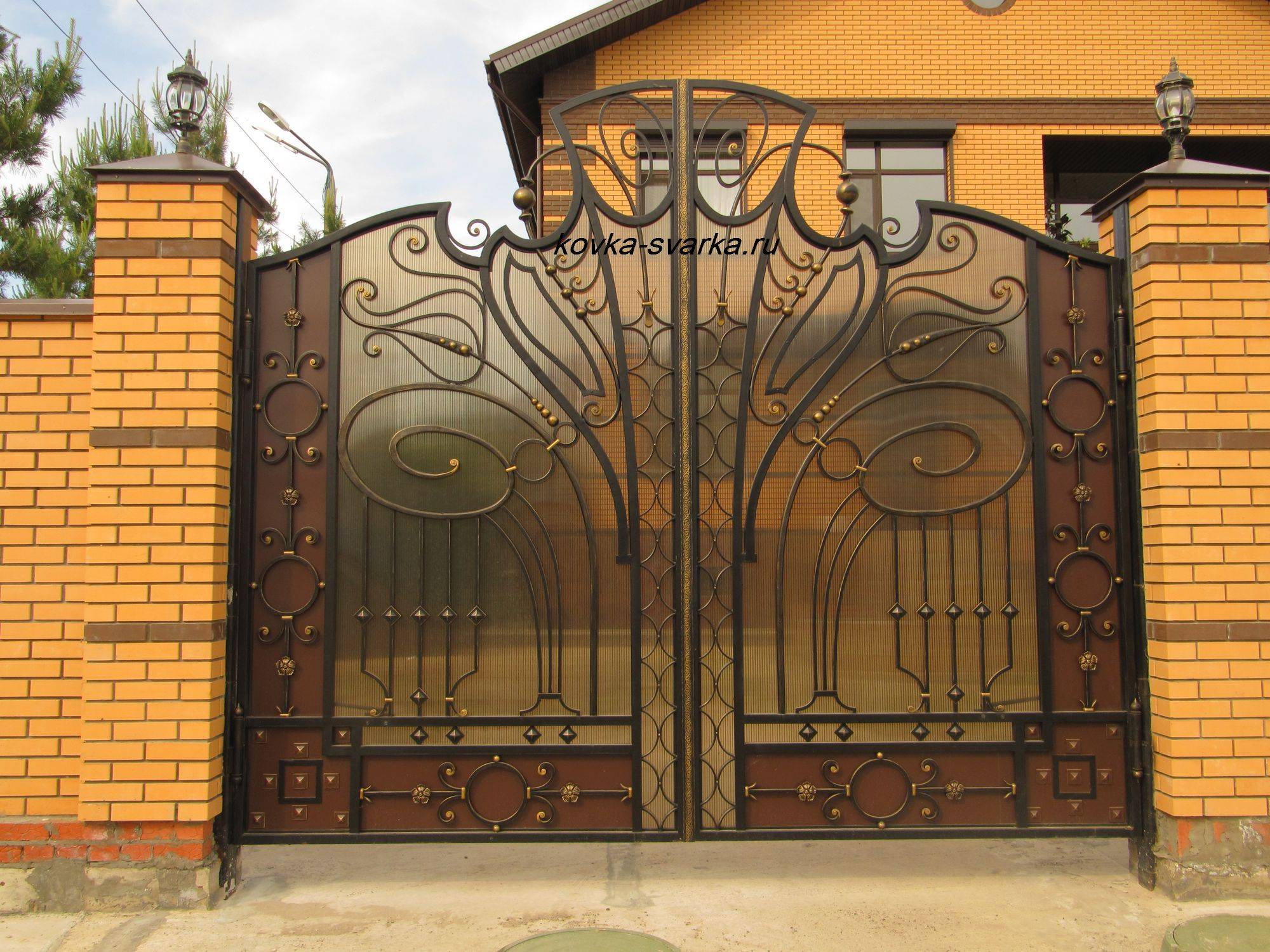 Популярным сочетанием являются кованые воротины с кирпичными столбами.
