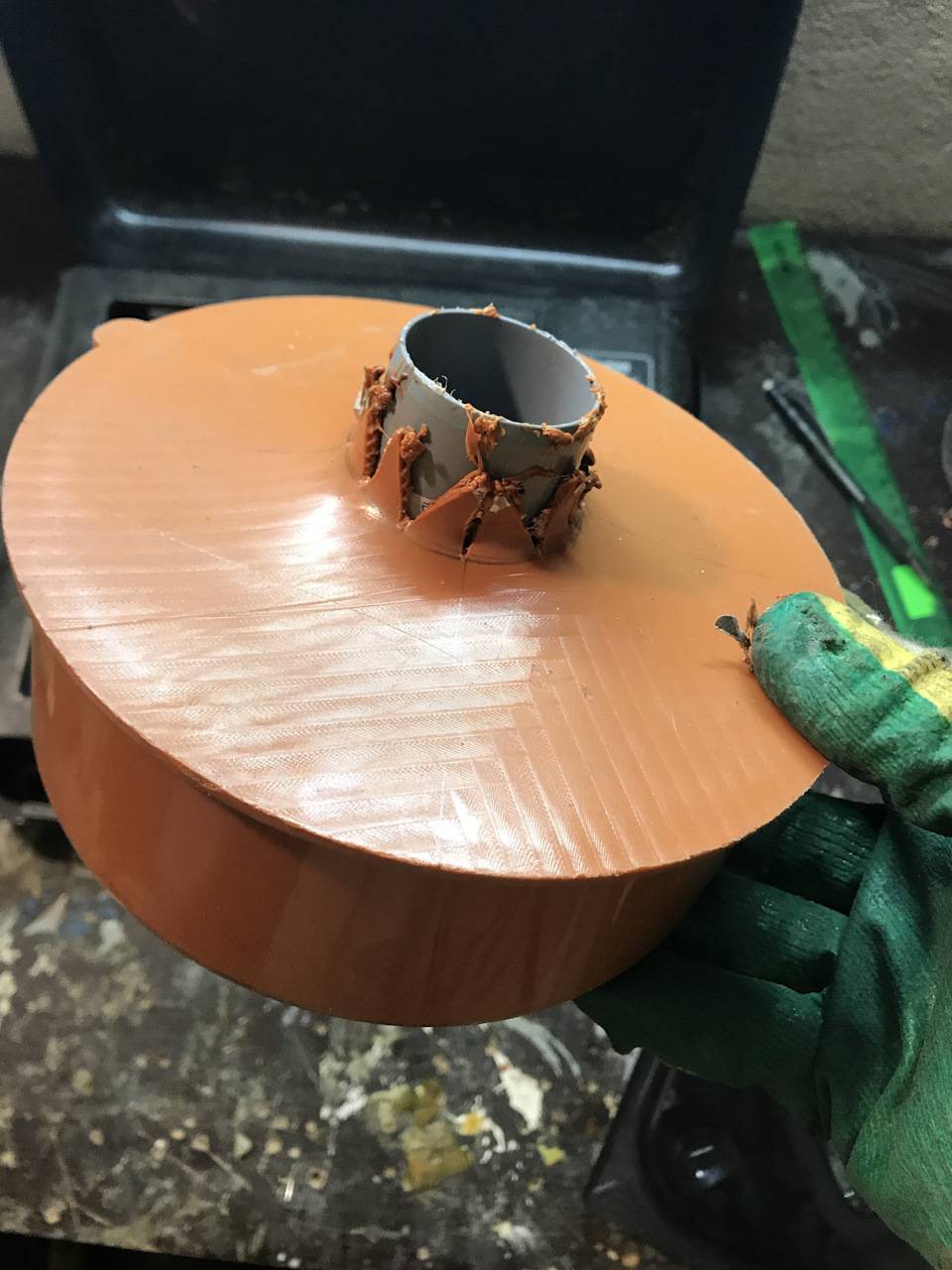 - Вставить трубу в вырезанную крышку и закрепить саморезами.