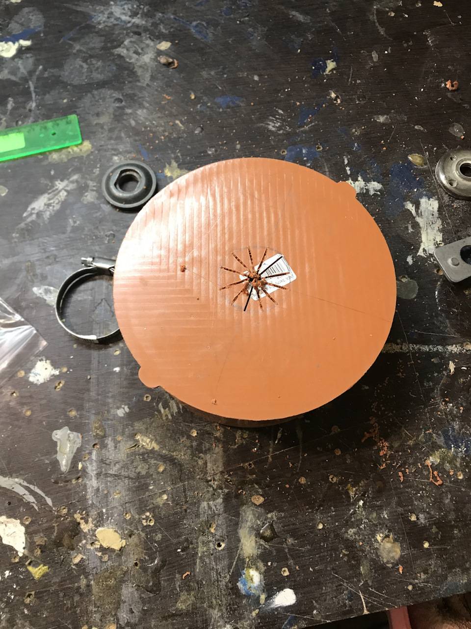 Далее вырезаем крышку из металической пластины (не алюминий), крепим ее к кожуху (предварительно завернув верхнюю часть кожуха)