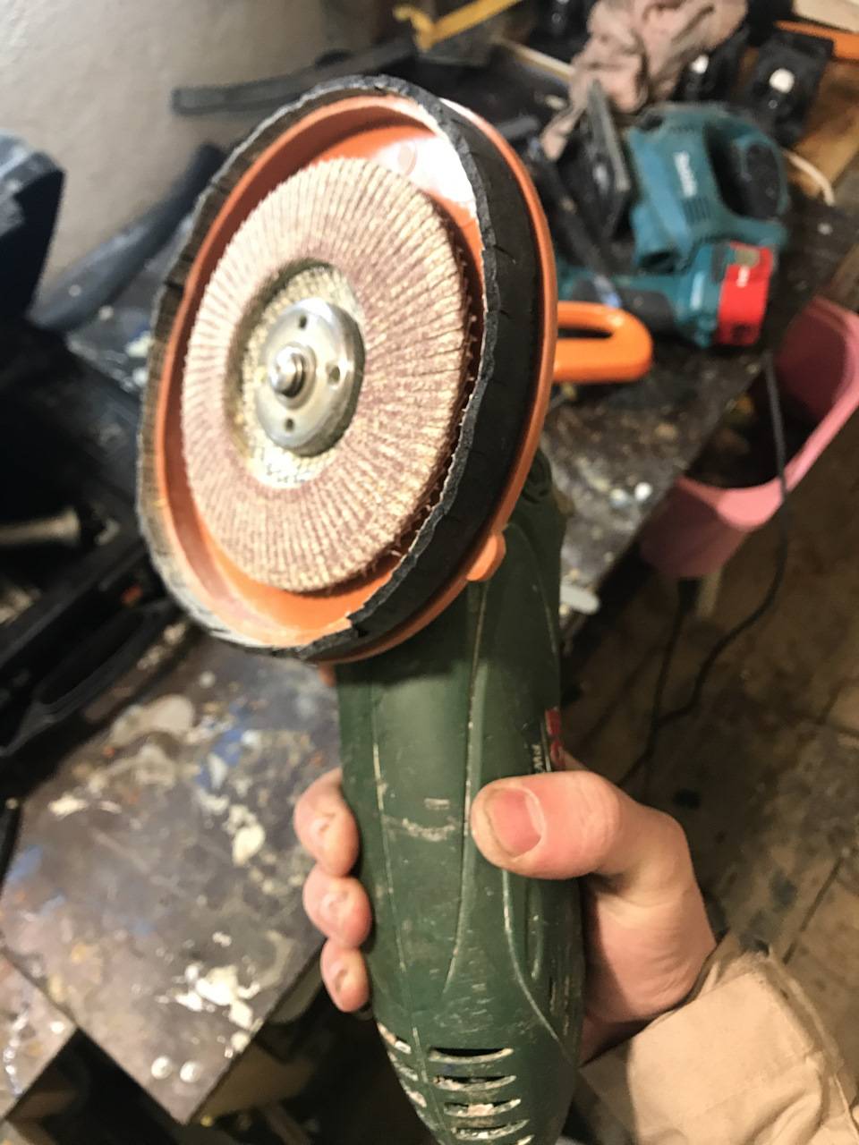 - Удаление старого лакокрасочного покрытия. Перед нанесением свежей краски старую требуется удалить. Используется лепестковый наждачный круг. Снимаемая им краска получается мелкой.