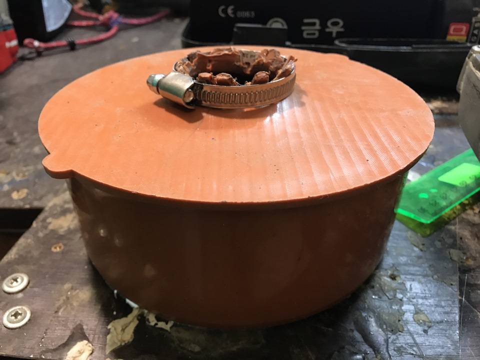 Далее необходимо прикрепить кожух к болгарке с помощью прочного хомута и специального переходного кольца. К сборке этой детали нужно отнестись предельно внимательно. Отверстие в канистре закрывается крышкой, которую можно перенести на противоположную сторону при изменении направления вращения режущего диска.