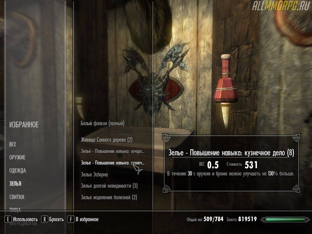 Обратите внимание! Чтобы усилить свойства зелья «Повышение навыка: кузнечное дело», крафтите его, надев доспехи с чарами на «Повышение навыка: алхимия»