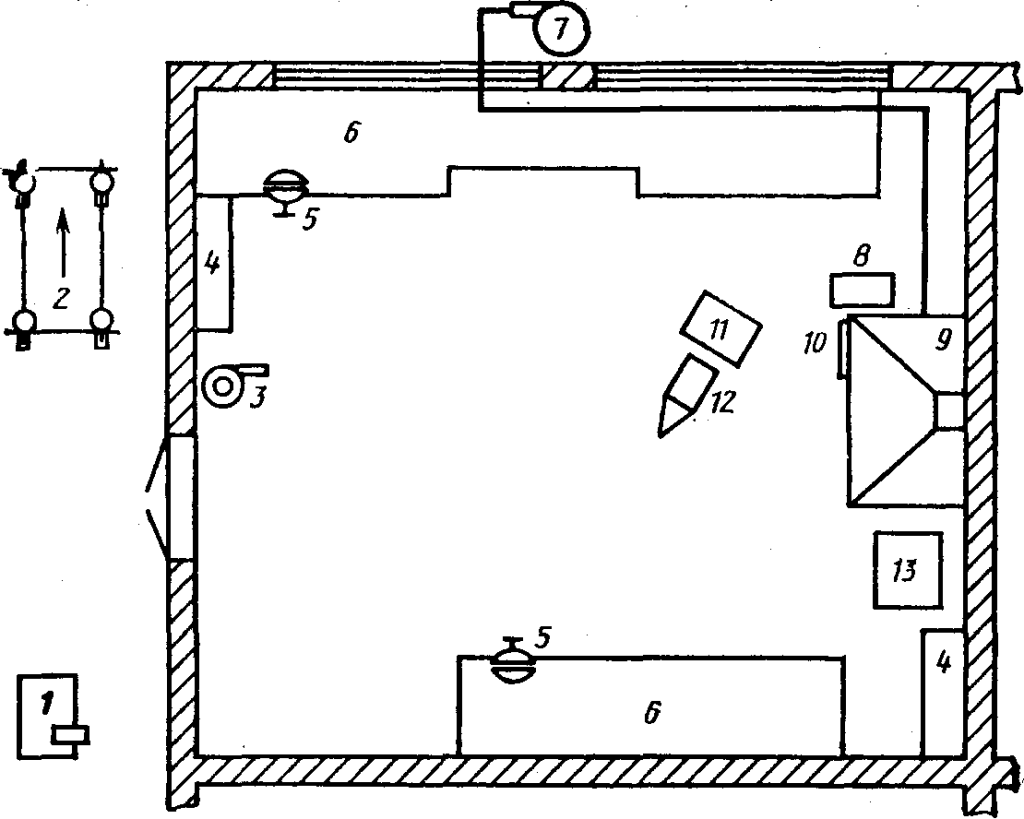 Размещение оборудования в кузнице: 1— наждачный станок; 2 — станок для ковки; 3. трубогиб; 4 — шкафы для инструментов; 6 — тиски; 6 — верстак; 7 — вентилятор; 8 — бак с водой; 9 — горн; 10 — вешалки для инструмента; 11- стол для инструмента; 12 —наковальня; 13 — ящики с углем.