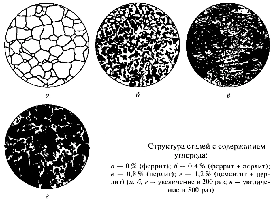 Как показано на двойной диаграмме, решетки аллотропных форм железа (δ, γ и α или дельта, гамма и альфа) служат «растворителем» для образования соответственно твердых δ-, γ- и α-растворов углерода в железе.