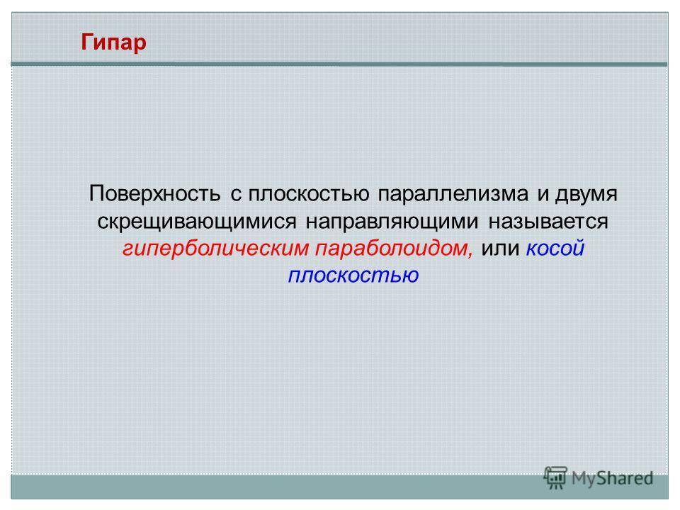 Поверхность с плоскостью параллелизма и двумя скрещивающимися направляющими называется гиперболическим параболоидом, или косой плоскостью Гипар
