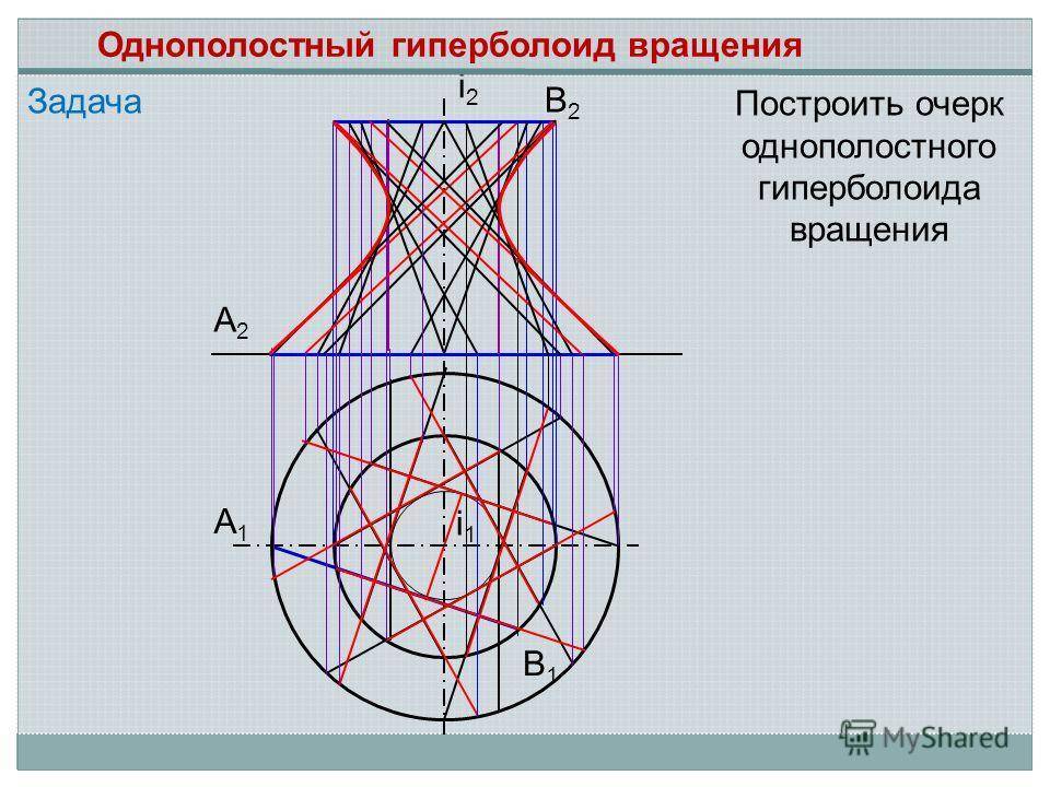 Задача А2А2 А1А1 В1В1 В2В2 i2i2 i1i1 Построить очерк однополостного гиперболоида вращения Однополостный гиперболоид вращения