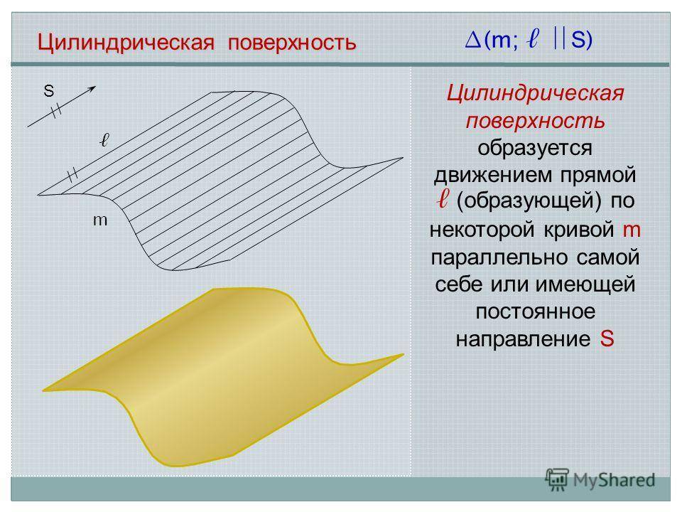 Цилиндрическая поверхность m (m; S ) S // Цилиндрическая поверхность образуется движением прямой (образующей) по некоторой кривой m параллельно самой себе или имеющей постоянное направление S