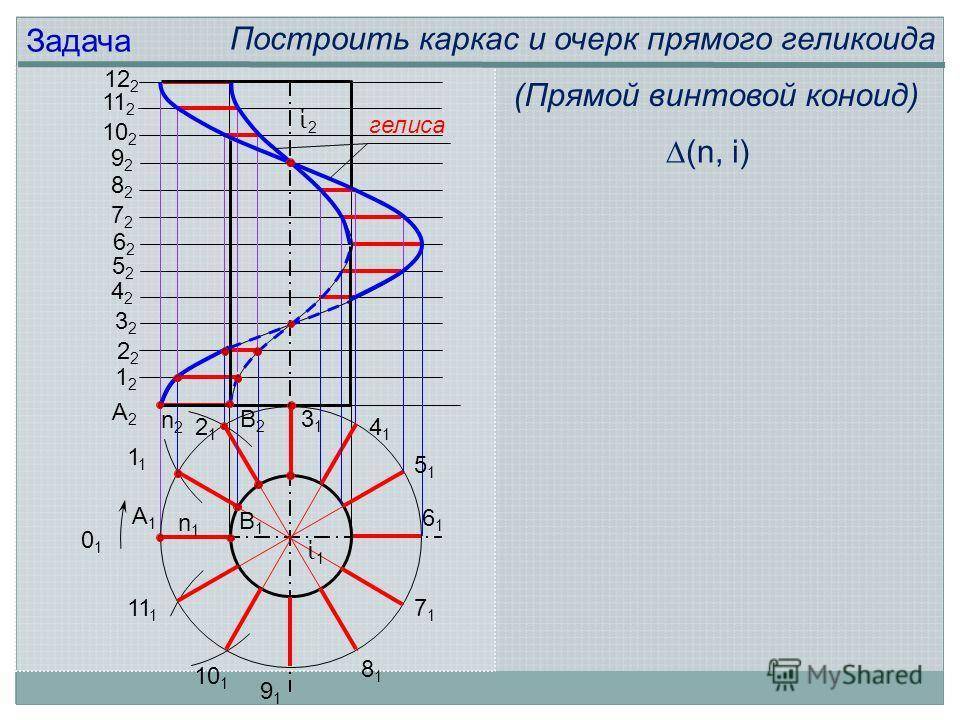 n2n2 n1n1 гелиса А1А1 В1В1 ί1ί1 ί2ί2 Задача Построить каркас и очерк прямого геликоида А2А2 В2В (Прямой винтовой коноид) (n, i)