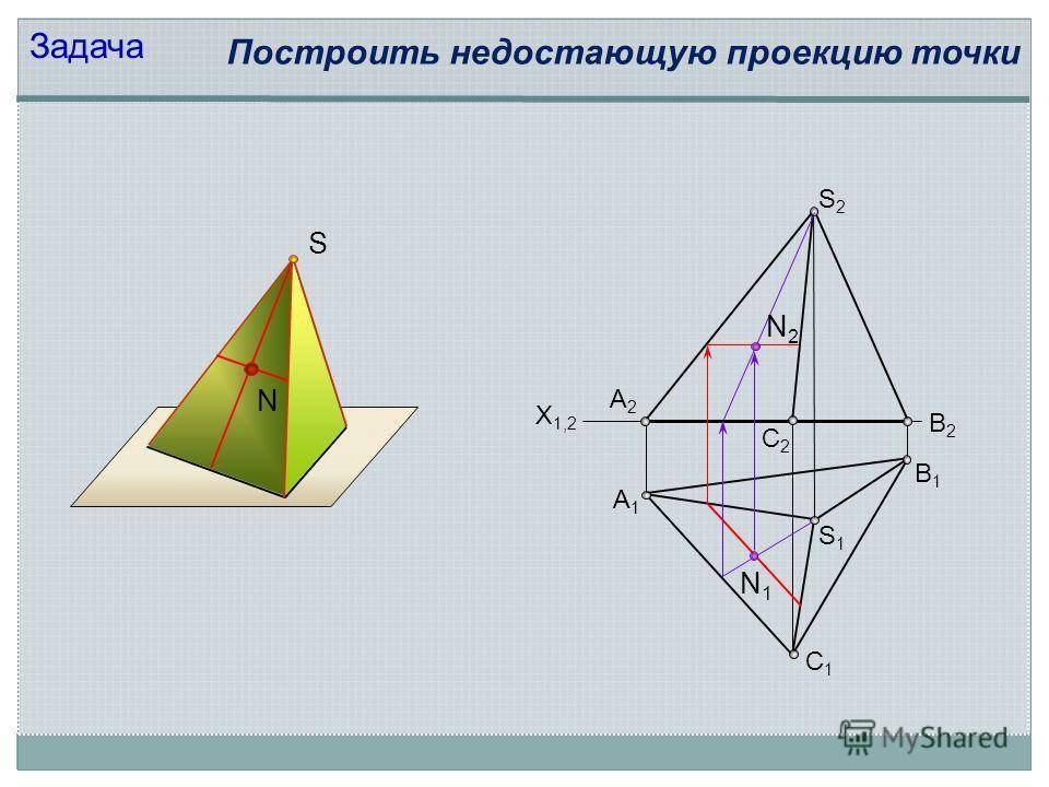 S А1А1 С1С1 В1В1 S2S2 X 1,2 S1S1 А2А2 С2С2 В2В2 Задача Построить недостающую проекцию точки N N2N2 N1N1