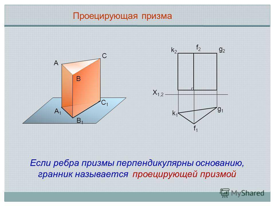 Проецирующая призма А В С С1С1 В1В1 А1А1 k2k2 k1k1 f1f1 g1g1 g2g2 f2f2 X 1,2 Если ребра призмы перпендикулярны основанию, гранник называется проецирующей призмой