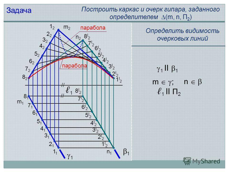 m2m2 n2n2 n1n1 m1m1 Задача Построить каркас и очерк гипара, заданного определителем (m, n, П 2 ) I21I2 2I22I2 3I23I2 4I24I2 5I25I2 6I26I2 7I27I2 8I28I I21I2 2I22I2 3I23I2 4I24I2 5I25I2 6I26I2 7I27I2 8I28I2 // парабола ll 1 n m ; 1 1 ll П 2 Определить видимость очерковых линий