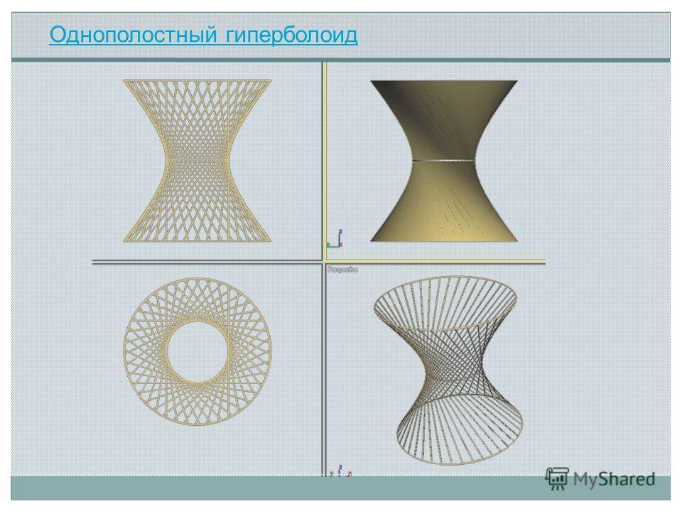 Но оказывается, что кроме конусов и цилиндров линейчатыми поверхностями второго порядка являются еще однополостный гиперболоид и гиперболический параболоид. Этот факт на взгляд не очевиден, однако легко доказывается алгебраически.