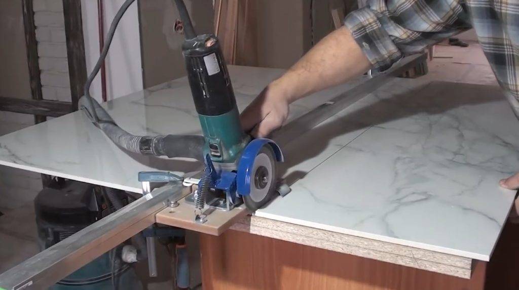 Самодельный плиткорез из болгарки готов. На фото выше мастер с его помощью красиво и аккуратно разрезал целый слэб. Единственный недостаток такого станка – необходимость постоянной перестановки направляющей и ее точное выставление, хотя и этот момент можно при желании технически доработать.
