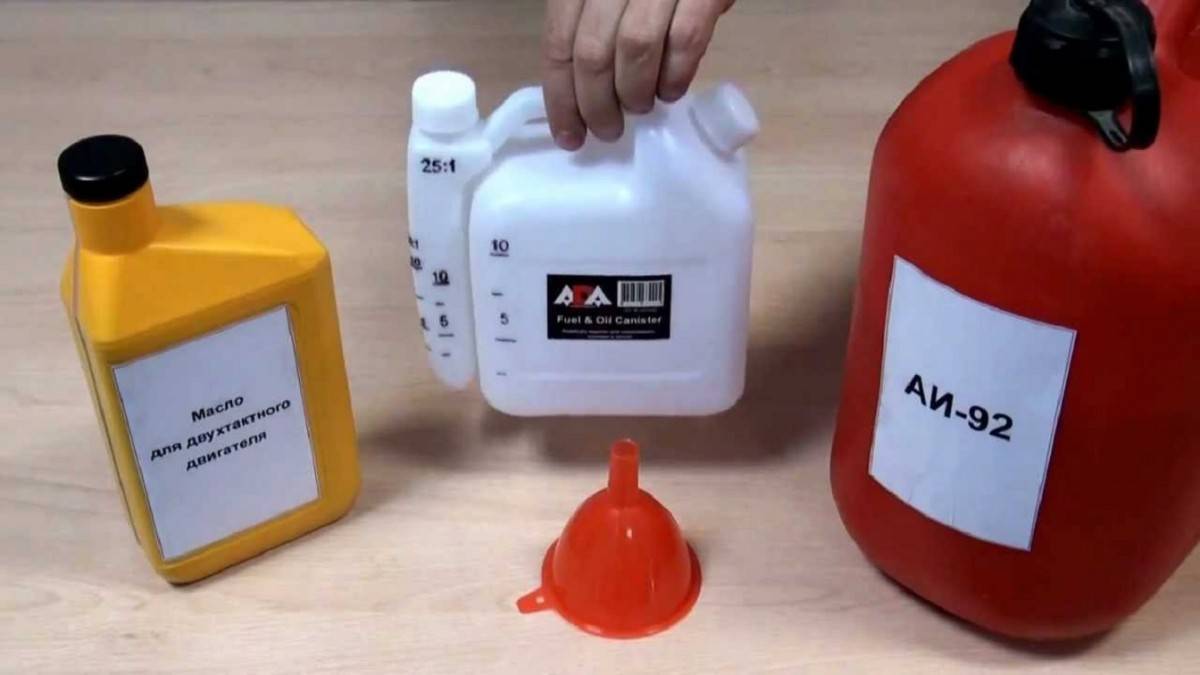 Заливать топливо и смазочный материал нужно через лейку, чтобы предотвратить потери компонентов. Для того чтобы используемая смазка полностью растворилась в горючем, заполненную емкость потребуется несколько раз встряхнуть. В результате бензиновая смесь должна стать равномерно цвета. При этом нужно проследить, чтобы на дне сосуда не было осадков.