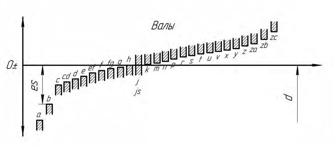 Основные отклонения стандартизованы (ГОСТ 25346-2013). Предусмотрено по 27 вариантов основных отклонений для валов и отверстий. Каждому из основных отклонений соответствует определенный уровень относительно номинального размера (на схемах – относительно нулевой линии), от которого должен начинаться интервал допуска (рис. 2).