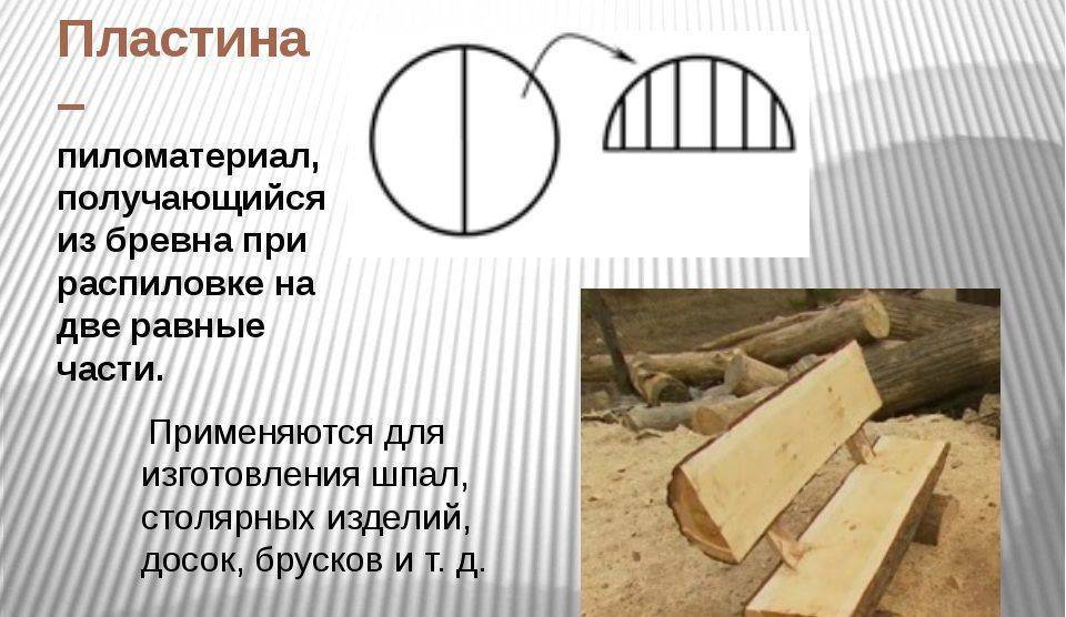 Пластины изготавливать очень просто, но для процесса требуется – разрубить бревно вдоль на две части. У пластин одна сторона выпуклая, а другая – прямая. Пластины могут иметь разный размер, но он напрямую зависит от размера используемого бревна. Материал чаще всего применяется для производства досок, брусьев и шпал.