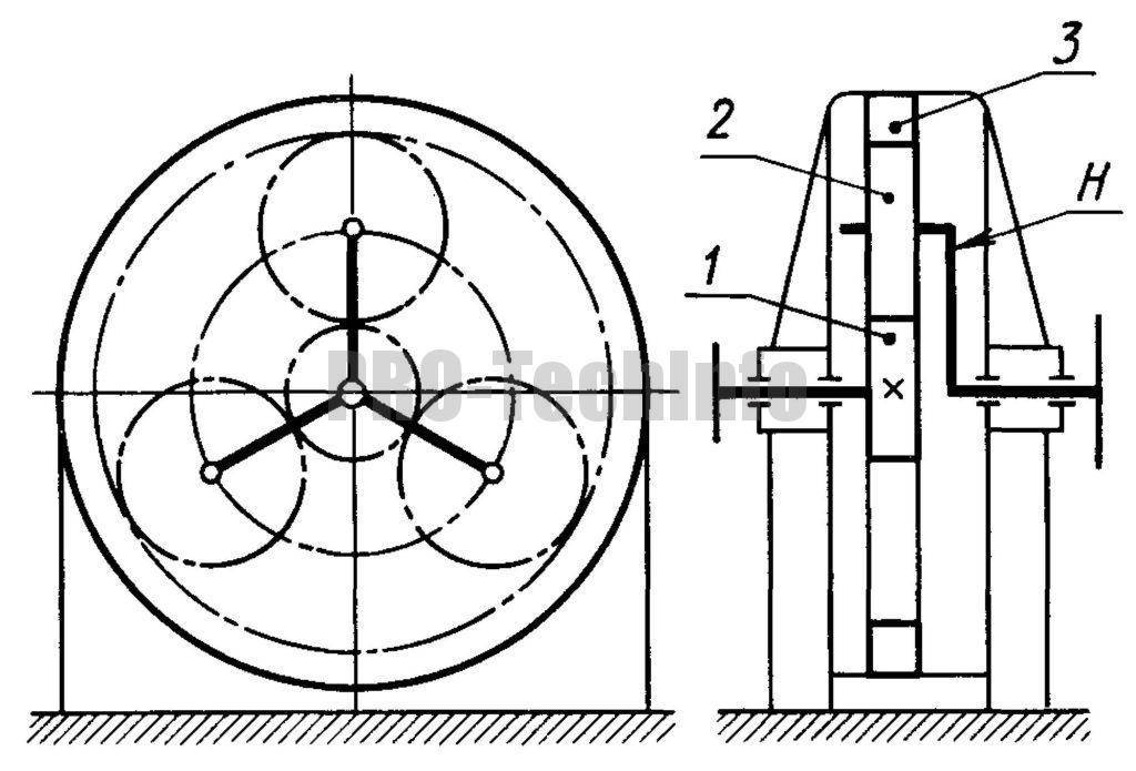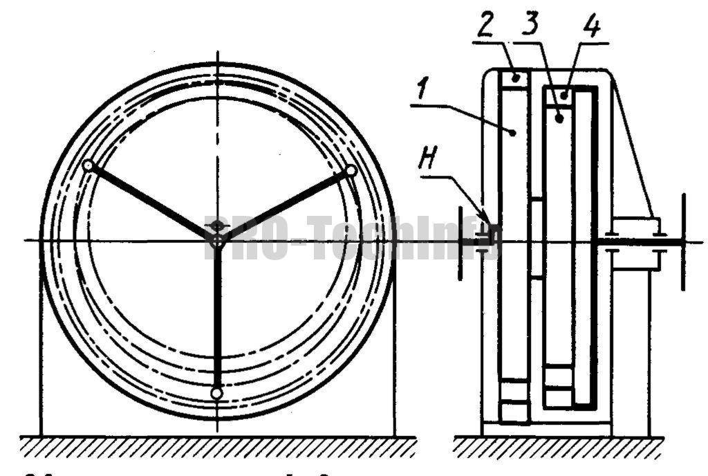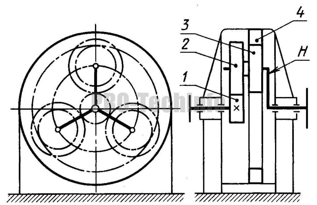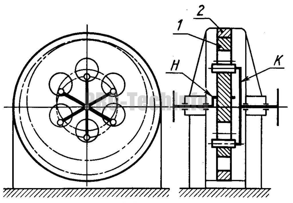 Водило Н — ведущее, вал с кривошипами К — ведомый. Центральное колесо 2 закреплено в корпусе.