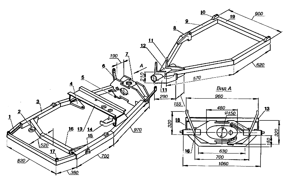 На ней должны быть предусмотрены степени нагрузки разных частей рамы, а также общие размеры устройства. Заняться этим можно самостоятельно, а можно воспользоваться чертежами тех, кто уже с успехом осуществил сборку самодельного адаптера.