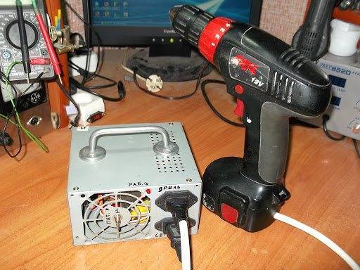 | Применение блока питания от компьютера | Вариант достаточно простой — инструмент подключается к компьютерному блоку. Но это габаритный элемент, который занимает много места. Но зато такой блок найти легко — подойдет практически любой, если он имеет мощность от 300 Вт. |