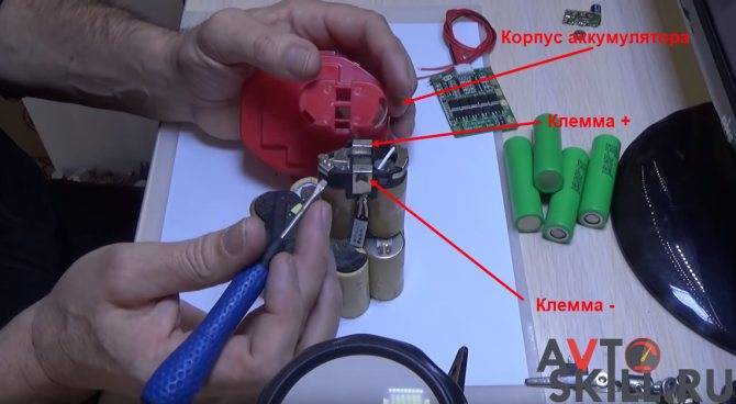 После диагностики прошедшие проверку элементы собираются в линейку. Подобранный набор нужно спаять в прежнем порядке. Корпус банки имеет отрицательную полярность, а средняя шина — положительную. Потом, без сборки аккума, следует подключить к нему зарядное устройство. При всем этом нужно держать под контролем температуру частей. Если они исправны, то сильного перегрева не нужно держать. По истечении времени зарядки, также через день на каждом элементе следует замерить напряжение. Если какой-нибудь аккумулятор «садится» больше чем на 10 %, его требуется поменять новым. Когда батарея пройдет тест, есть вариант собрать ее корпус совсем. Винты крепления вворачиваются на место соответственно размерам, в качестве клея используют ацетат-акрилат («Супер-клей»). При грамотном подборе частей батарея будет служить как новенькая. После зарядки ее следует подвергнуть насыщенной тренировке, создав критическую нагрузку шуруповерту, пока он не разрядится. Такие циклы следует повторить еще Дважды, а затем — по 1 разу в квартал.