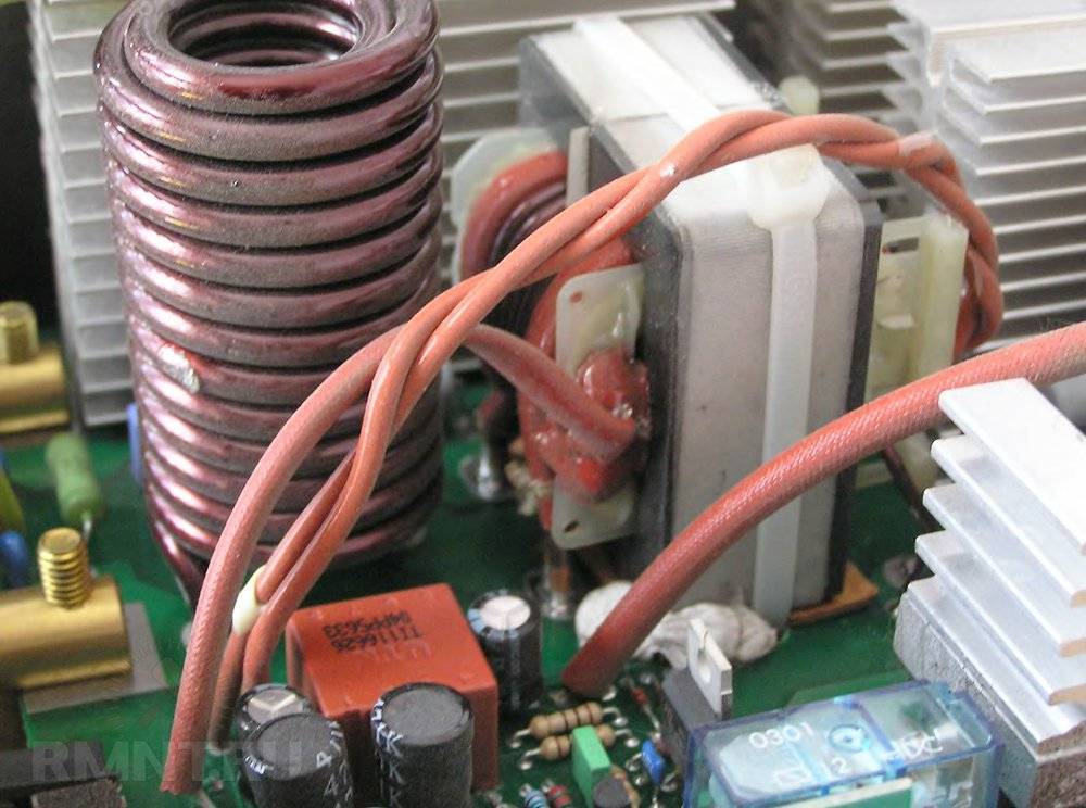 Полученное высокочастотное напряжение подается на высокочастотный трансформатор. Напряжение на нем понижается, ток увеличивается. Через его первичную обмотку протекает высокое напряжение небольшой силы тока, а со вторичной снимается более низкое напряжение, но сила тока уже порядка 150-220 ампер — в зависимости от мощности и класса аппарата.