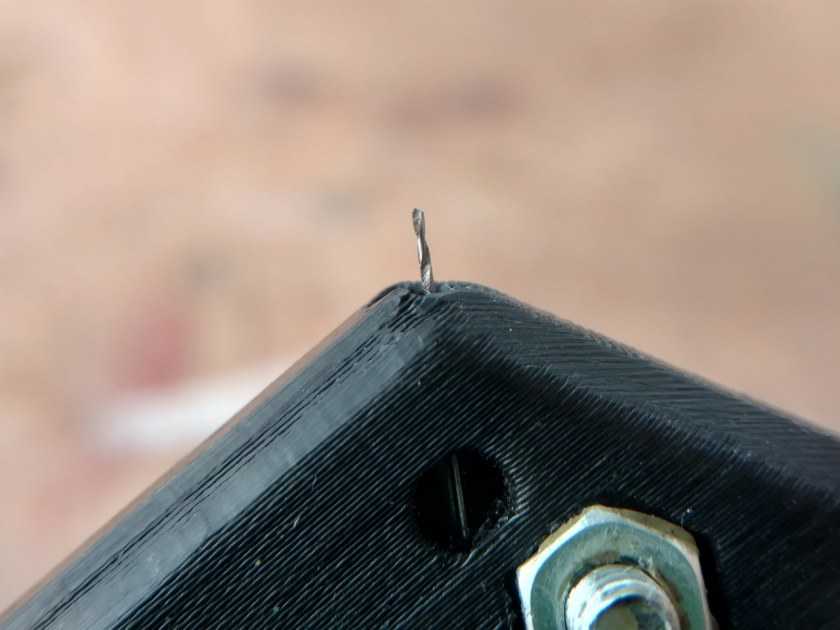 - Далее следует заложить сверло и убедиться, что угол заточки инструмента, который равен 120°, и грани гайки совпадают.