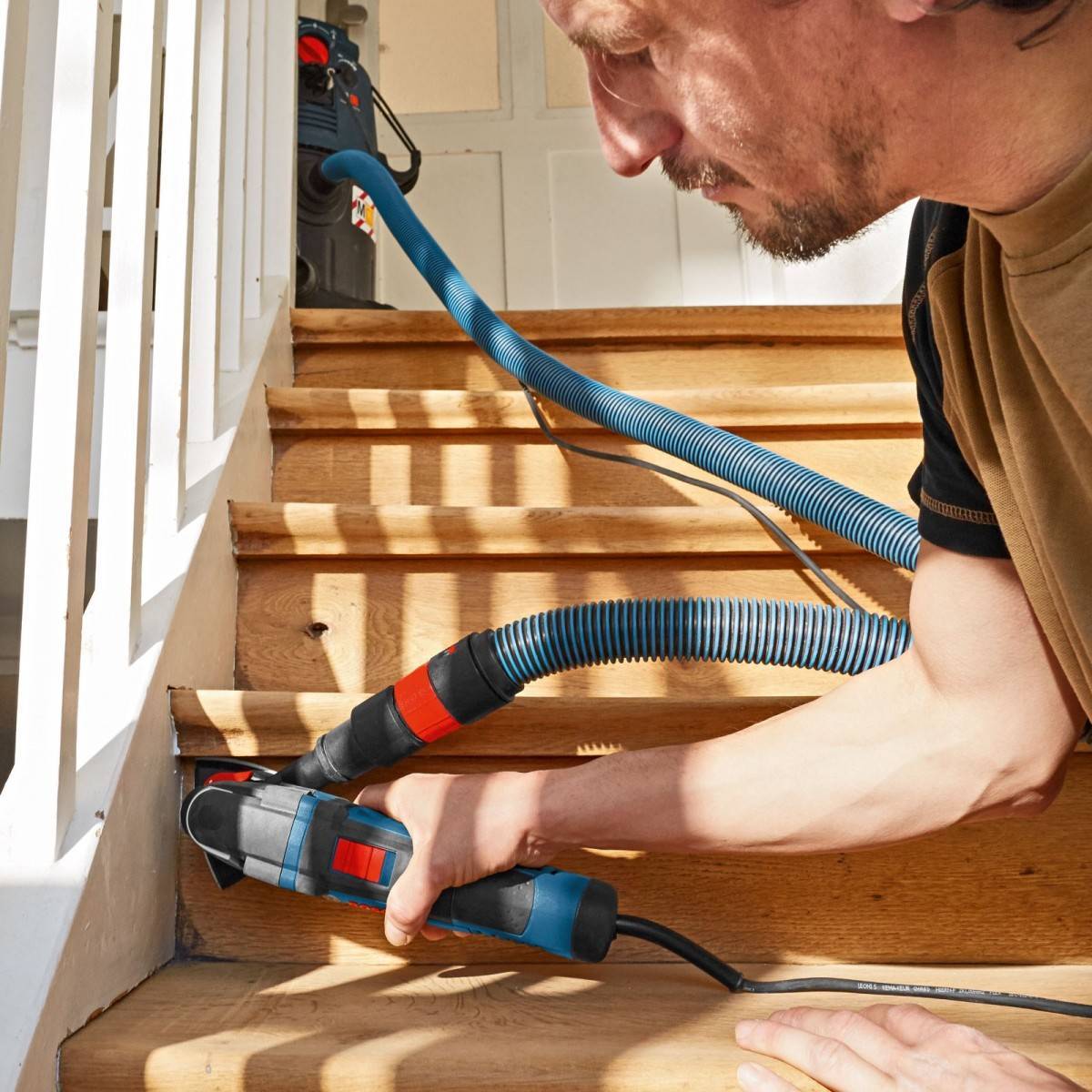 Бюджетный реноватор оснащен дополнительной рукояткой, которая может устанавливаться в двух положениях. В комплект включен патрубок для подключения пылесоса. Это позволяет быстро и эффективно очистить рабочую поверхность.