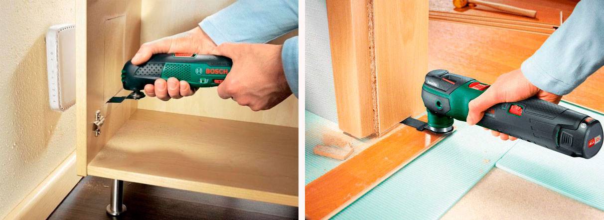 Мастеровые люди знают и ценят эту особенность инструмента. Колебательные движения реноватора могут достигать 330 в секунду, они не имеют больших амплитуд, поэтому в финишной отделке при строительстве устройства весьма востребованы.Мультитулом хорошо делать небольшие желоба и выемки в дереве. С помощью специальной насадки подобным инновационным инструментом можно снимать старые покрытия (лаки, краски, праймеры). Реноватор подходит для удаления со стен и пола старой плитки или керамогранита, но для больших объемов работ (обработки значительных площадей) такой камерный инструмент непригоден.