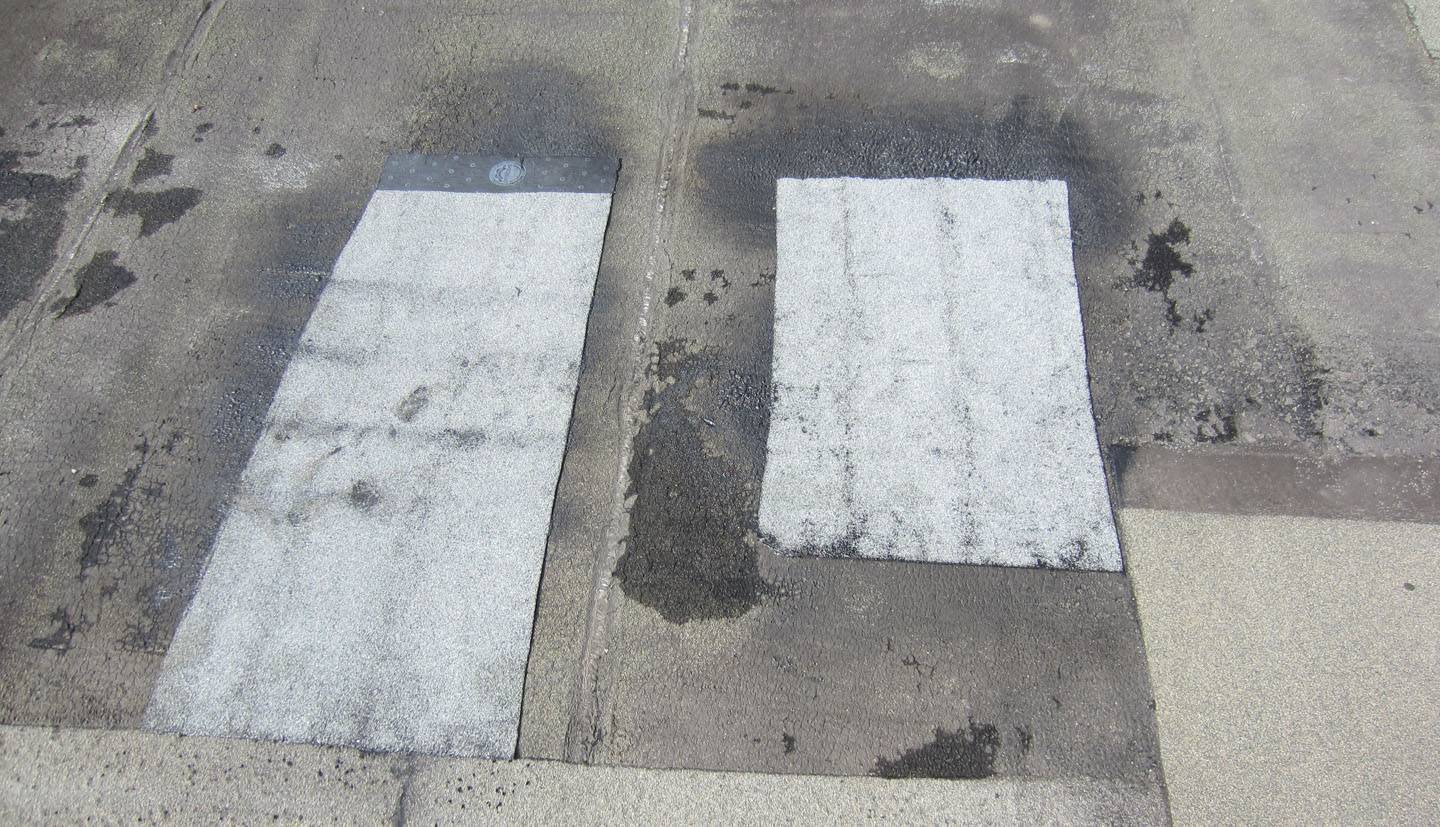 Такие работы идеально подходят для скатных кровель, покрытых современными аналогами рубероида. Весной на старом полотне хорошо заметны дефекты, полученные во время чистки кровли. Они незначительны, поэтому для ремонта достаточно подготовить место повреждения нужным образом и перекрыть его заплаткой чуть большего размера.