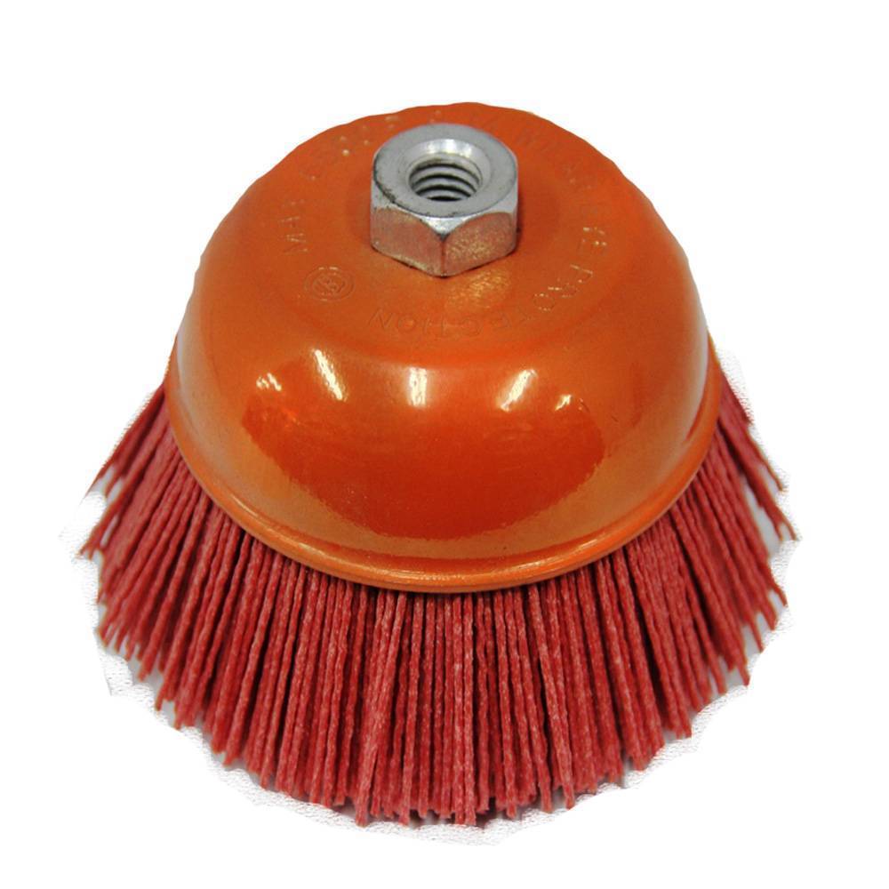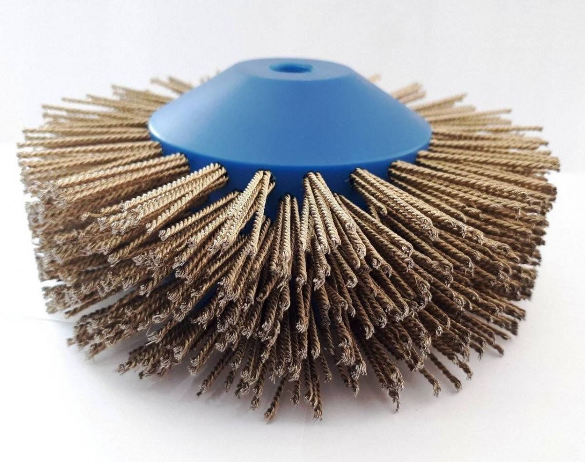 Конического вида щетка применяется, как насадка для дрели, и используется в местах, куда трудно добраться, чтобы провести зачистку. За счет своеобразной конструкции она легко проникает в такие места, выполняя задачи, которые не по силам другим видам аналогичных насадок.