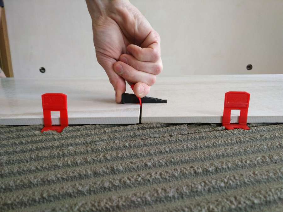 Пока плиточный клей не высох, при помощи специального клинышка, вставленного в клипсу, две соседние плитки точно выравниваются по горизонтали.
