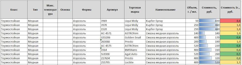 Артикулы (для удобного копирования):AS-004-R — Abro — Anti-seize thread lubricant10690 — CRC — Copper Paste3080 — Liqui Moly — Liqui Moly Kupfer-Paste7579 — Liqui Moly — Liqui Moly Kupfer-Paste09128 — Permatex — Copper Anti-Seize Lubricant31163 — Permatex — Copper Anti-Seize LubricantCE500G — Comma — Comma Copper Ease1910 — ВМПАвто — Медная смазка МС 16401911 — ВМПАвто — Медная смазка МС 16401912 — ВМПАвто — Медная смазка МС 16401913 — ВМПАвто — Медная смазка МС 16409896 / 2270 — Mannol — Kupferpaste4014835200029 — Ravenol — Kupferpaste