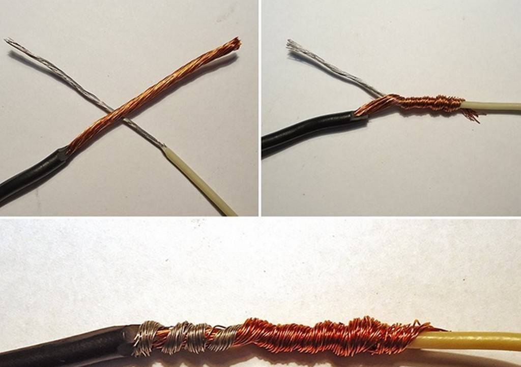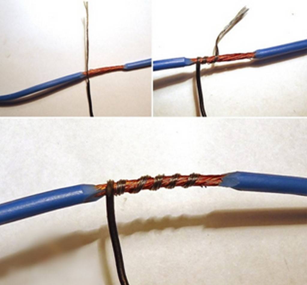 При данном способе концов жил удаляется изоляция, после чего их нужно соединять таким образом, чтобы зачищенные участки располагались параллельно, а концы жил были направлены в одну и ту же сторону. Затем концы провода накручивают друг на друга по спирали