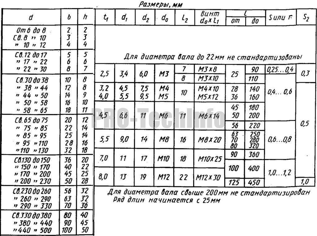 | Диаметр вала | Сечение шпонки bхh | Шпоночный паз | ||||||