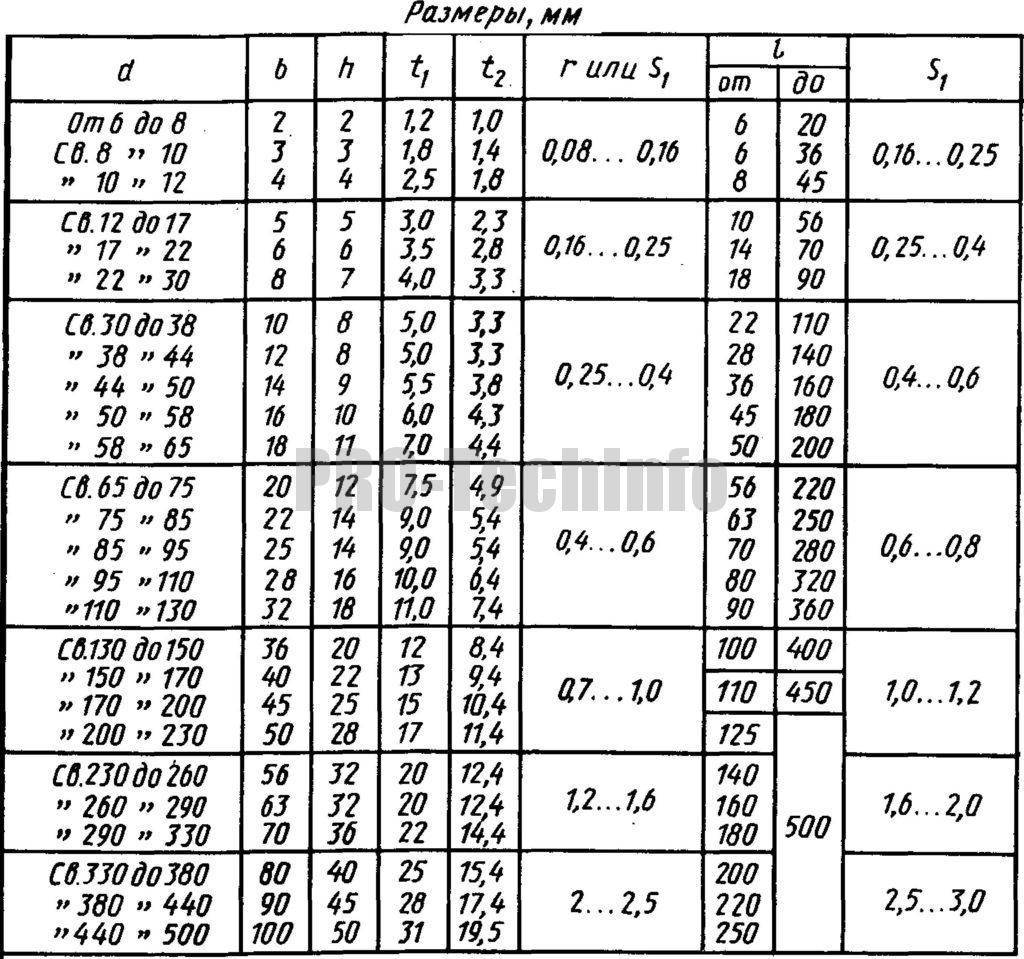 При производстве проводится учет размеров шпоночного материала. В большинстве случаев на производственную площадку поставляется пруток. Длина его может составлять около 1000 миллиметров, в некоторых случаях выпуск проводится под заказ. Наиболее распространены следующие размеры шпонки: