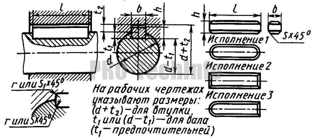 На чертежах обозначение призматических шпонок происходит исходя из нормативного документа ГОСТ. Они делятся на шпоночные пазы: высокие, нормальной высоты и направляющие. Рабочими гранями у них являются боковые.
