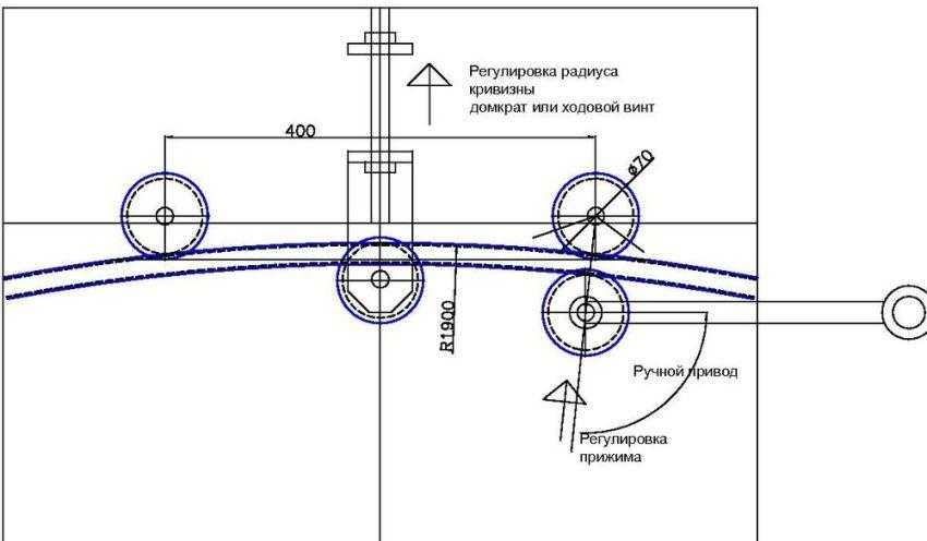 Третий вал размещается еще выше, между первыми двумя. Расстояние между крайними валами и центральным элементом можно менять. Это повлияет на радиус изгиба. Однако важно чтобы оба крайних элемента были на одинаковом расстоянии от центрального вала. В дальнейшем этот параметр можно менять в зависимости от радиуса изгиба, который необходимо получить в конкретном случае.