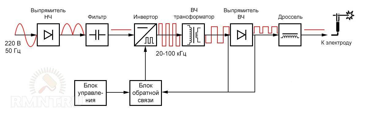 Чем дороже сварочный инвертор, тем больше в его схеме вспомогательных узлов, задействованных в реализации специальных функций. А вот сама схема силового преобразователя остаётся практически неизменной даже у дорогостоящего оборудования. Этапы превращения сетевого электрического тока в сварочный достаточно легко проследить — на каждом из основных узлов схемы происходит определённая часть общего процесса.