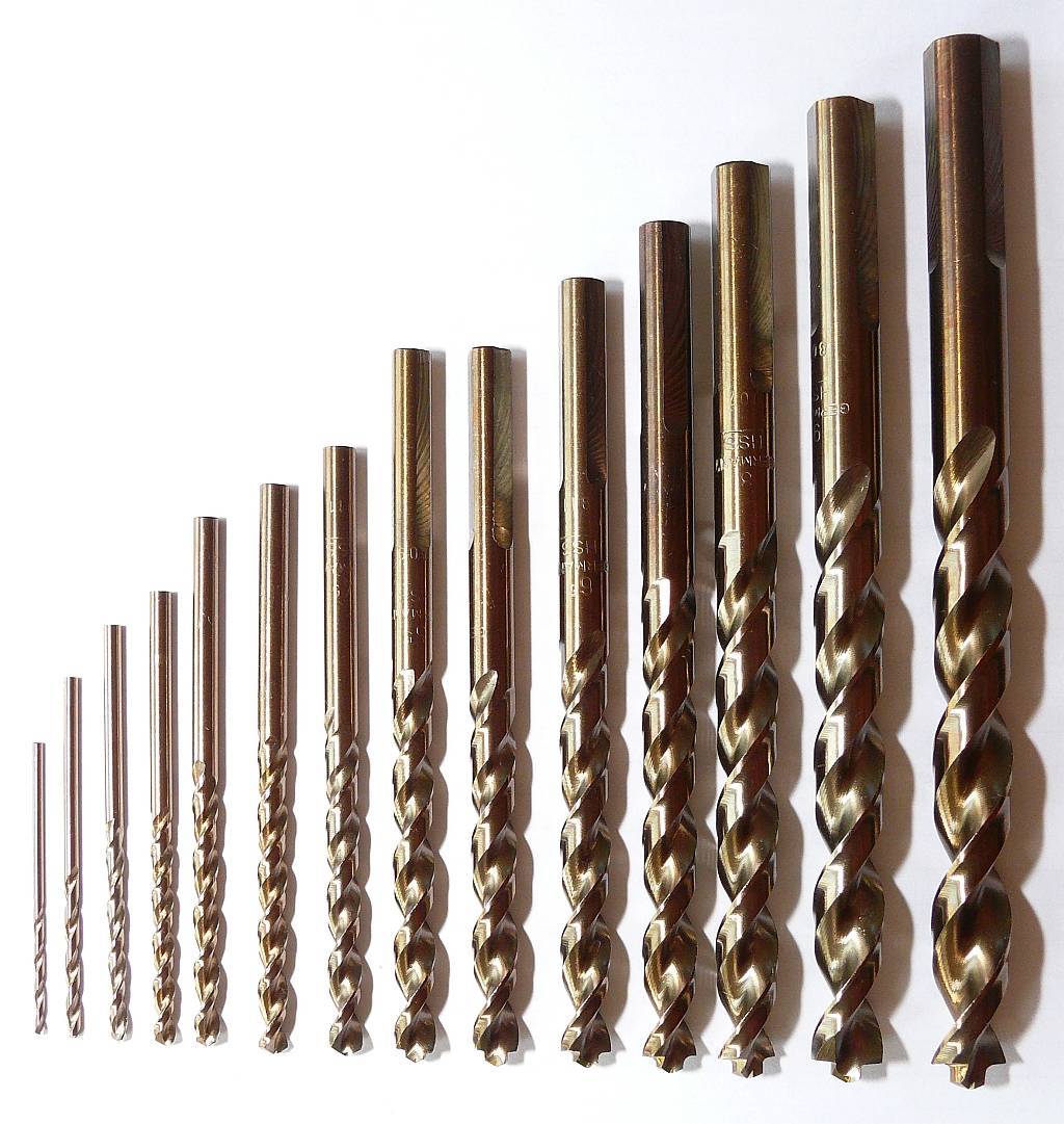 Для сверления высокопрочных металлов предназначены сверла из быстрорежущей стали Р9 стандарта DIN 338. Эти сверла могут работать как со стационарными так и с ручными дрелями. Красностойкость описываемого сверла по металлу повышается из-за высокого содержания в составе инструмента кобальта и прочих легирующих элементов. Эти кобальтовые сверла широко используются для выполнения отверстий в нержавеющих, кислотоупорных, тугоплавких и высоколегированных сталях, плотность которых достигает 1000 Н/мм.