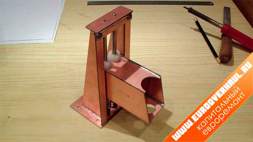 | Из металлического листа толщиной 10−12 мм изготавливается основание (плита) станка, на котором просверливаются отверстия, предназначенные для его последующего крепления. К плите приваривается металлический профиль (стойка) сечением 40×40 мм. | |