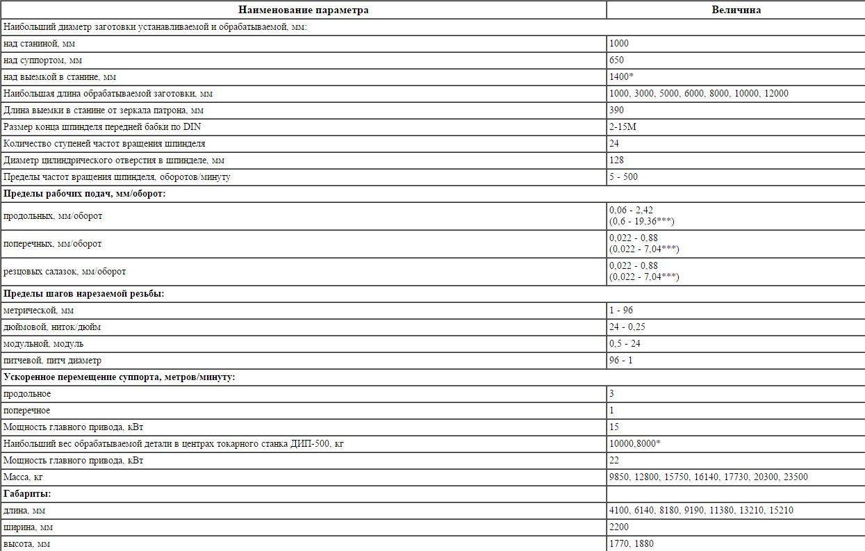- главный рабочий вал станка: сечение внутреннего отверстия – 10,5 см; количество скоростей (прямых и обратных) – 22 и 11; количество оборотов – от 18 до 1800 в минуту (обратное вращение), от 10 до 1250 в минуту (прямое вращение); мощность привода – 13 кВт;