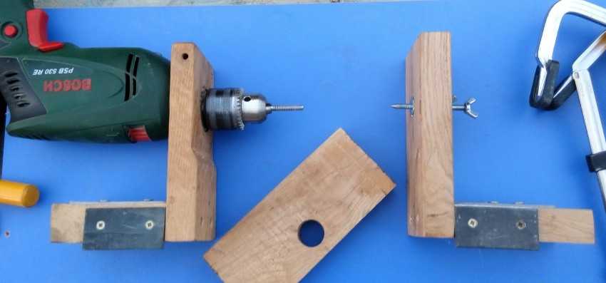 - фиксатор для дрели вместо струбцины и хомута можно сконструировать из 3х фанерок, соединив их таким образом, чтобы получилась конструкция в виде буквы «П», и уже к ней прикрепить посадочное гнездо под шейку дрели;