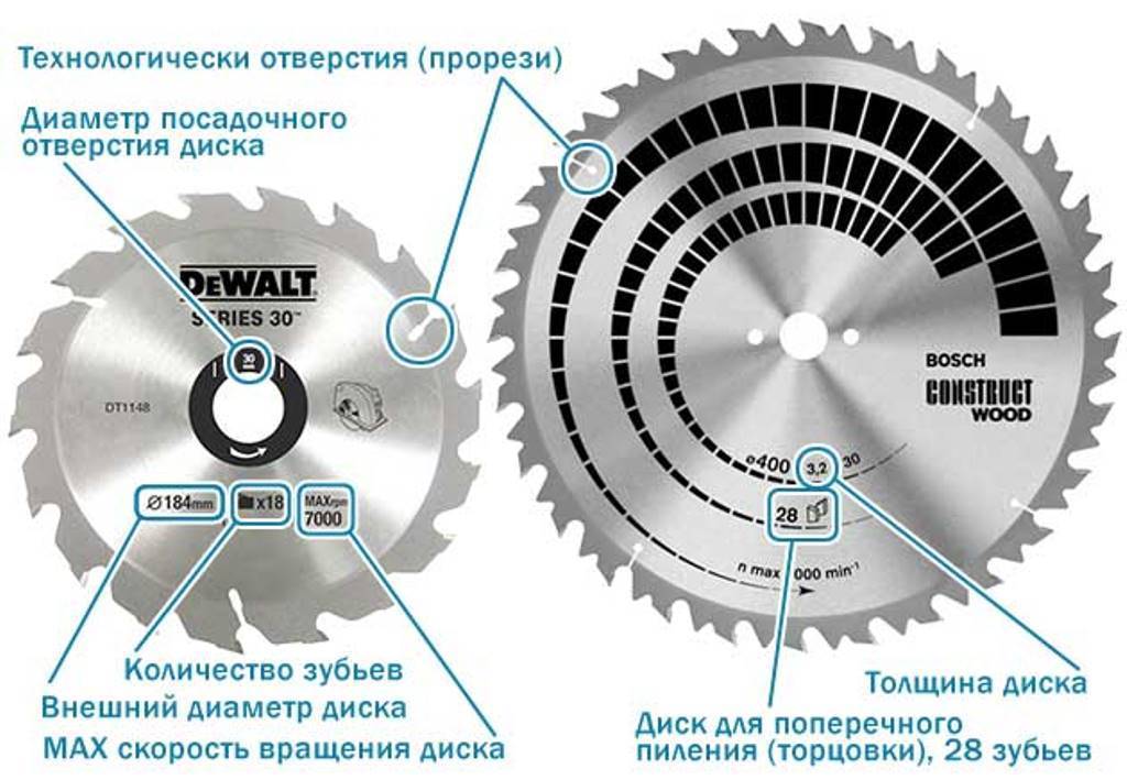 Все эти параметры нанесены на самом диске, в определённом месте. Для распила более тонких заготовок (например, из ламината) потребуется диск с большим числом зубьев.